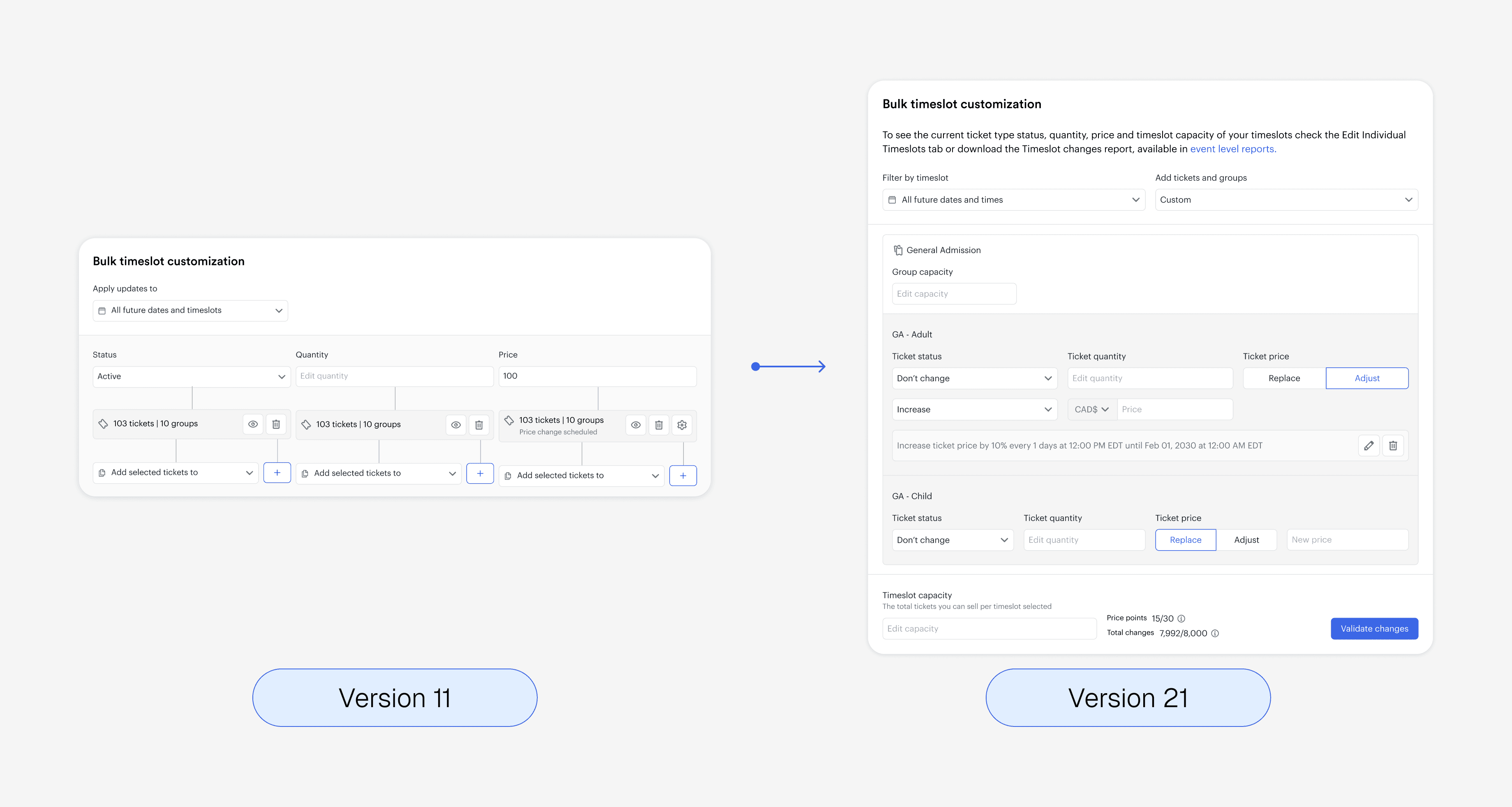 We decided on an iterative release to test with users along the way, starting with selecting the tickets and timeslots users wanted to edit and actioning the same price, quantity, and capacity for each.